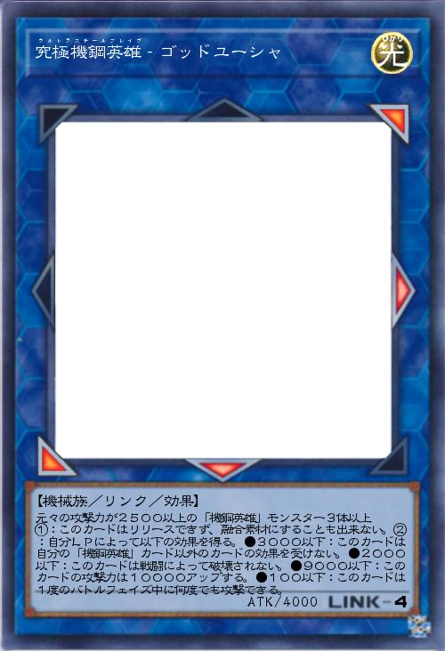 | 元々の攻撃力が2500以上の「機鋼英雄」モンスター3体以上 ①:このカードはリリースできず、融合素材にすることも出来ない。②:自分LPによって以下の効果を得る。●3000以下:このカードは自分の「機鋼英雄」カード以外のカードの効果を受けない。●2000以下:このカードは戦闘によって破壊されない。●9000以下:このカードの攻撃力は10000アップする。●100以下:このカードは1度のバトルフェイズ中に何度でも攻撃できる。 | |||
