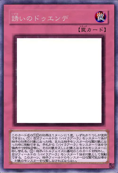 | このカード名の①②の効果は1ターンに1度、いずれか1つしか使用できない。①:自分フィールドの「バイラアーラ」モンスター1体が相手の効果の対象になった時、または相手モンスターの攻撃対象になった時に発動できる。手札から「バイラアーラ」モンスター1体を守備表示で特殊召喚し、その対象を正しい対象となるそのモンスターに移し替える。②:相手バトルフェイズに墓地のこのカードを除外し、自分フィールドの「バイラアーラ」モンスター1体を対象として発動できる。このターン、相手フィールドのモンスターは攻撃可能な場合、対象のモンスターを攻撃しなければならない。 | |||