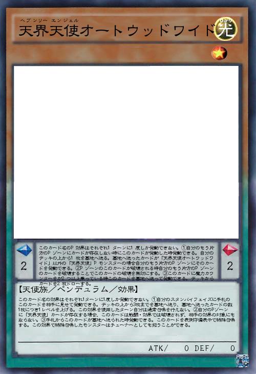 | このカード名のP効果はそれぞれ1ターンに1度しか発動できない。①自分のもう片方のPゾーンにカードが存在しない時にこのカードが発動した時発動できる。自分のデッキの上から1枚を墓地へ送る。墓地へ送ったカードが「天界天使オートウッドワイド」以外の「天界天使」Pモンスターの場合自分のもう片方のPゾーンにそのカードを発動できる。②Pゾーンのこのカードが破壊される時自分のもう片方のPゾーンのカードを破壊することでこのカードの破壊を無効にする。③このカードに魔力カウンターをが2つ以上乗っている時このカードを墓地へ送って発動できる。デッキからカードを2枚ドローする。 | |||
