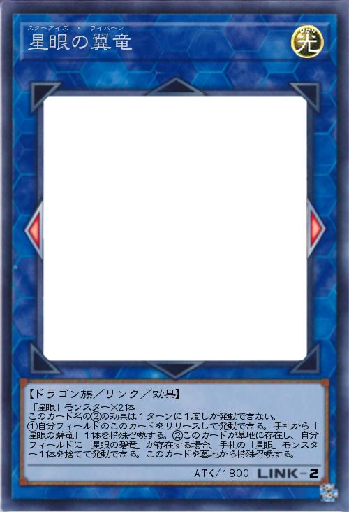 | 「星眼」モンスター×2体 このカード名の②の効果は1ターンに1度しか発動できない。 ①自分フィールドのこのカードをリリースして発動できる。手札から「星眼の碧竜」1体を特殊召喚する。②このカードが墓地に存在し、自分フィールドに「星眼の碧竜」が存在する場合、手札の「星眼」モンスター1体を捨てて発動できる。このカードを墓地から特殊召喚する。 | |||