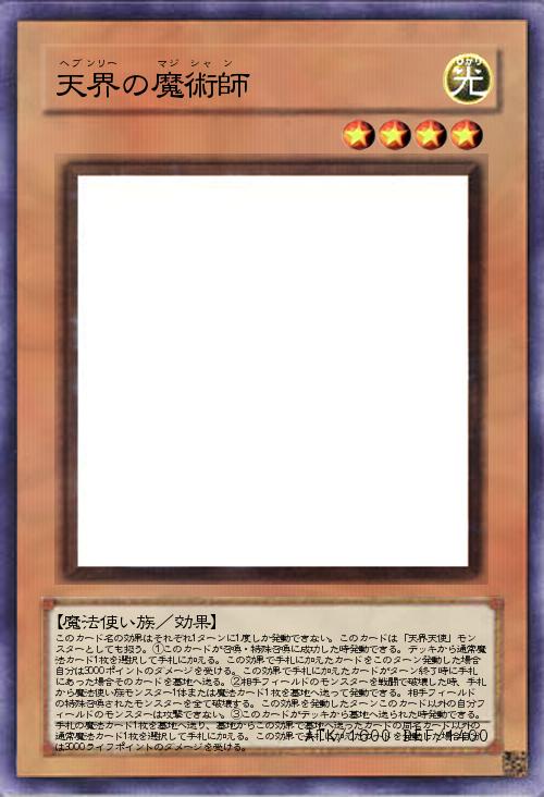| このカード名の効果はそれぞれ1ターンに1度しか発動できない。このカードは「天界天使」モンスターとしても扱う。①このカードが召喚・特殊召喚に成功した時発動できる。デッキから通常魔法カード1枚を選択して手札に加える。この効果で手札に加えたカードをこのターン発動した場合自分は3000ポイントのダメージを受ける。この効果で手札に加えたカードがターン終了時に手札にあった場合そのカードを墓地へ送る。②相手フィールドのモンスターを戦闘で破壊した時、手札から魔法使い族モンスター1体または魔法カード1枚を墓地へ送って発動できる。相手フィールドの特殊召喚されたモンスターを全て破壊する。この効果を発動したターンこのカード以外の自分フィールドのモンスターは攻撃できない。③このカードがデッキから墓地へ送られた時発動できる。手札の魔法カード1枚を墓地へ送り、墓地からこの効果で墓地へ送ったカードの同名カード以外の通常魔 | |||