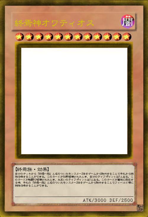 | 自分のデッキから「終焉一族」と名のついたモンスター2体をゲームから除外することで手札から特殊召喚することができる。このカードが効果破壊されたとき、自分のライフポイントは1となる。このカードが戦闘で破壊されたとき、お互いのライフポイントは1となる。このカードが墓地に存在する時、手札の「終焉一族」と名のついたモンスター2体をゲームから除外することでフィールド場に特殊召喚することができる。 | |||