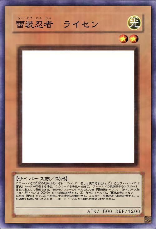 | このカード名の①②の効果はそれぞれ1ターンに1度しか使用できない。①:自分フィールドに「雷装」カードが存在する場合、このカードを手札から捨て、 フィールドの表側表示モンスター1体を対象として発動できる。そのモンスターのレベル2につき「雷装機トークン」(サイバース族・光・星4・攻/守1000/0)を1体特殊召喚する。②:自分フィールドに「雷装忍者ライセン」以外の「雷装」モンスターが存在する場合に発動できる。このカードを墓地から特殊召喚する。この効果で特殊召喚したこのカードは、フィールドから離れた場合に除外される。 | |||