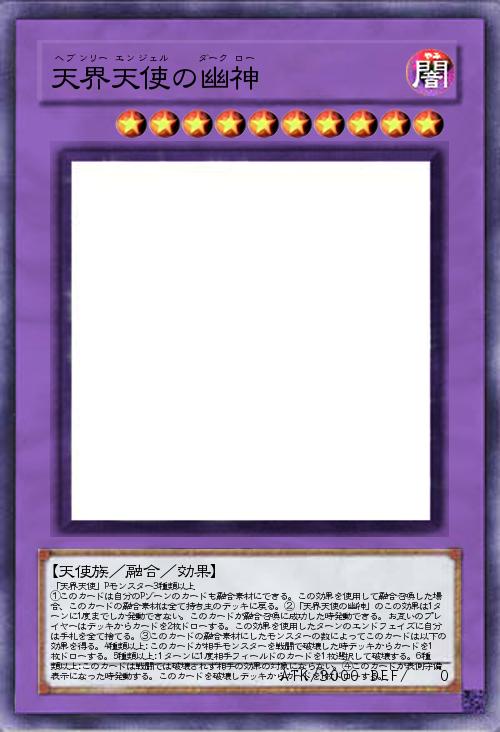 | 「天界天使」Pモンスター3種類以上 ①このカードは自分のPゾーンのカードも融合素材にできる。この効果を使用して融合召喚した場合、このカードの融合素材は全て持ち主のデッキに戻る。②「天界天使の幽神」のこの効果は1ターンに1度までしか発動できない。このカードが融合召喚に成功した時発動できる。お互いのプレイヤーはデッキからカードを2枚ドローする。この効果を使用したターンのエンドフェイズに自分は手札を全て捨てる。③このカードの融合素材にしたモンスターの数によってこのカードは以下の効果を得る。4種類以上:このカードが相手モンスターを戦闘で破壊した時デッキからカードを1枚ドローする。5種類以上:1ターンに1度相手フィールドのカードを1枚選択して破壊する。6種類以上:このカードは戦闘では破壊されず相手の効果の対象にならない。④このカードが表側守備表示になった時発動する。このカードを破壊しデッキからカード | |||