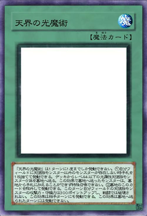 | 「天界の光魔術」は1ターンに1度までしか発動できない。①自分フィールドに天使族モンスター以外のモンスターが存在しない時手札を1枚捨てて発動できる。デッキからレベル4以下の光属性天使族モンスター3体を墓地へ送る。この効果で墓地へ送ったモンスターは、墓地から手札に加えることができず特殊召喚できない。②墓地のこのカードを除外して発動できる。このターン自分フィールドの天使族モンスターの攻撃力・守備力は300ポイントアップし、戦闘では破壊されない。この効果は相手ターンにも発動できる。この効果は墓地へ送られたターンには発動できない。 | |||