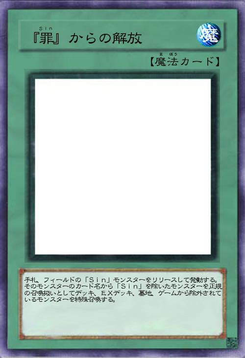 | 手札、フィールドの「Sin」モンスターをリリースして発動する。 そのモンスターのカード名から「Sin」を除いたモンスターを正規の召喚扱いとしてデッキ、EXデッキ、墓地、ゲームから除外されているモンスターを特殊召喚する。 | |||