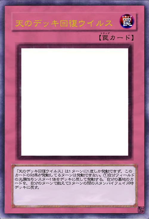 | 「天のデッキ回復ウイルス」は1ターンに1度しか発動できず、このカードの効果が発動してるターンは発動できない。①自分フィールドの光属性モンスター1体をデッキに戻して発動する。自分の墓地のカードを、自分のターンで数えて3ターンの間のスタンバイフェイズ時デッキに戻す。 | |||