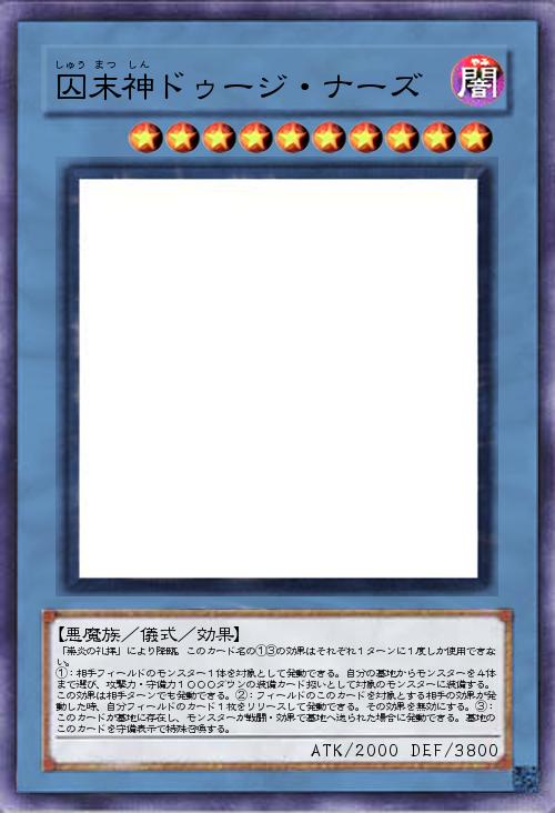 既に掲示板に出しているカードですが改めて投稿。クロノスギア2さんのssにて登場予定の「囚末神」の1体です。最大4000デバフと疑似対象耐性、緩い条件での蘇生と、中々に強力なカードですが、正直主人公側のデッキが強力で、少し力不足感があるかも?