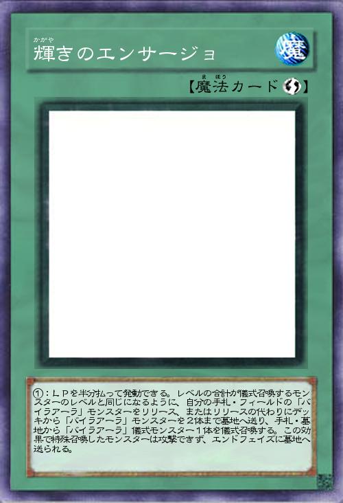 | ①:LPを半分払って発動できる。レベルの合計が儀式召喚するモンスターのレベルと同じになるように、自分の手札・フィールドの「バイラアーラ」モンスターをリリース、またはリリースの代わりにデッキから「バイラアーラ」モンスターを2体まで墓地へ送り、手札・墓地から「バイラアーラ」儀式モンスター1体を儀式召喚する。この効果で特殊召喚したモンスターは攻撃できず、エンドフェイズに墓地へ送られる。 | |||