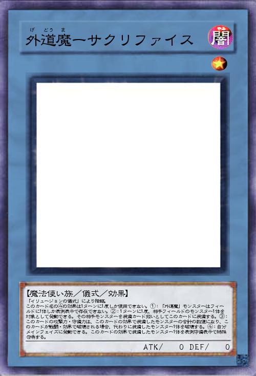「サクリファイスの外道魔モンスターです。お互いにダメージを与える効果を消した代わりに装備したモンスターを特殊召喚できるようにしました。」(2019-03-26 23:06)