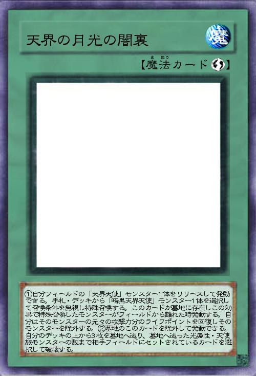 | ①自分フィールドの「天界天使」モンスター1体をリリースして発動できる。手札・デッキから「暗黒天界天使」モンスター1体を選択して召喚条件を無視し特殊召喚する。このカードが墓地に存在しこの効果で特殊召喚したモンスターがフィールドから離れた時発動する。自分はそのモンスターの元々の攻撃力分のライフポイントを回復しそのモンスターを除外する。②墓地のこのカードを除外して発動できる。自分のデッキの上から3枚を墓地へ送り、墓地へ送った光属性・天使族モンスターの数まで相手フィールドにセットされているカードを選択して破壊する。 | |||