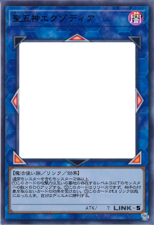 | 通常モンスターを含むモンスター2体以上 ①このカードの攻撃力は互いの墓地の存在するレベル3以下のモンスターの数×600アップする。②このカードはリリースできず、相手の対象を取らないカードの効果を受けない。③このカードがEXリンク状態になったとき、自分はデュエルに勝利する。 | |||