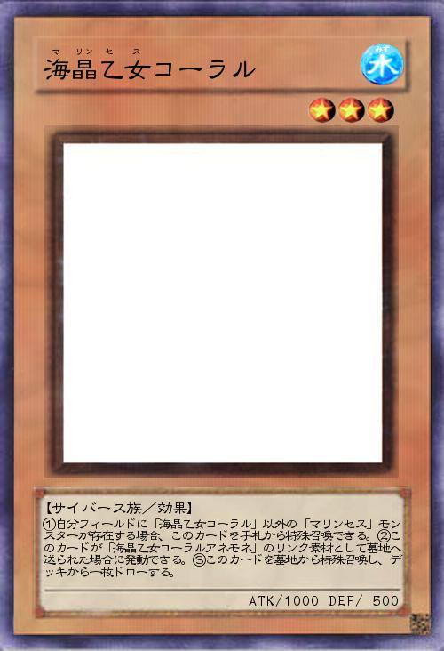 「来月発売のパックでマリンセスが出るんで作りました。黒槍のブラストと同様の特殊召喚効果に加え、コーラルアネモネのリンク素材になると自己再生して一枚ドローできるマリンセス。」(2019-03-29 23:08)