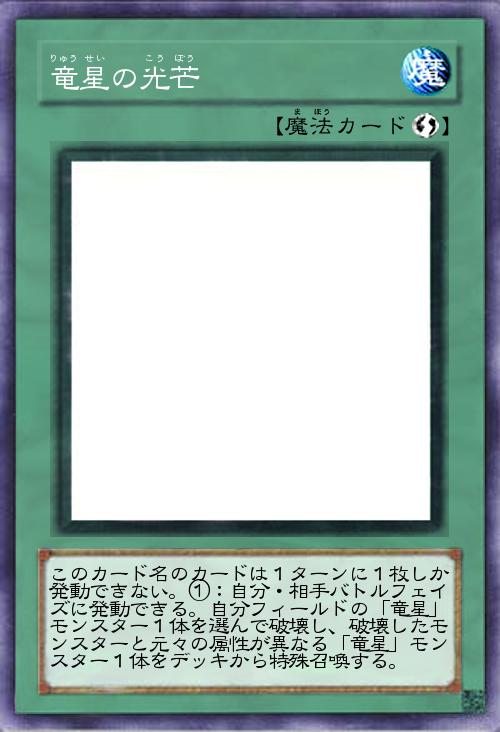 | このカード名のカードは1ターンに1枚しか発動できない。①:自分・相手バトルフェイズに発動できる。自分フィールドの「竜星」モンスター1体を選んで破壊し、破壊したモンスターと元々の属性が異なる「竜星」モンスター1体をデッキから特殊召喚する。 | |||