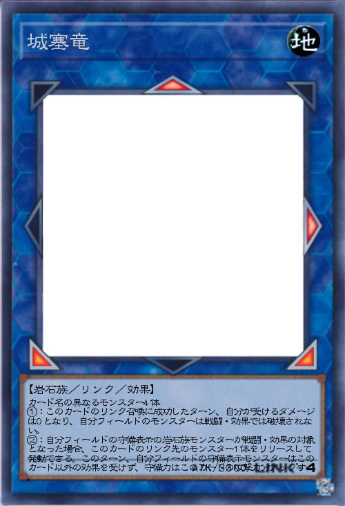 | カード名の異なるモンスター4体 ①:このカードのリンク召喚に成功したターン、自分が受けるダメージは0となり、自分フィールドのモンスターは戦闘・効果では破壊されない。 ②:自分フィールドの守備表示の岩石族モンスターが戦闘・効果の対象となった場合、このカードのリンク先のモンスター1体をリリースして発動できる。このターン、自分フィールドの守備表示モンスターはこのカード以外の効果を受けず、守備力はこのカードの攻撃力分アップする。 | |||