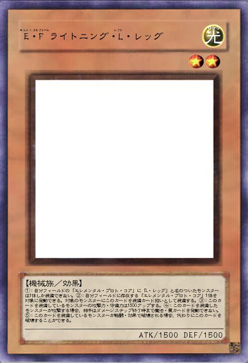 | ①:自分フィールドの「エレメンタル・プロト・コア」に「L・レッグ」と名のついたモンスターは1体しか装備できない。②:自分フィールドに存在する「エレメンタル・プロト・コア」1体を対象に発動できる。対象のモンスターにこのカードを装備カード扱いとして装備する。③:このカードを装備しているモンスターの攻撃力・守備力は1500アップする。④:このカードを装備したモンスターが攻撃する場合、相手はダメージステップ終了時まで魔法・罠カードを発動できない。⑤:このカードを装備しているモンスターが戦闘・効果で破壊される場合、代わりにこのカードを破壊することができる。 | |||
