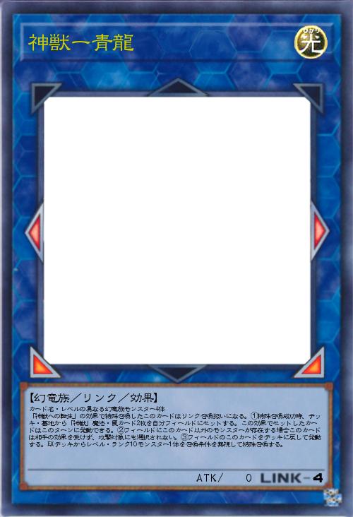 | カード名・レベルの異なる幻竜族モンスター4体 「神獣への転生」の効果で特殊召喚したこのカードはリンク召喚扱いになる。①特殊召喚成功時、デッキ・墓地から「神獣」魔法・罠カード2枚を自分フィールドにセットする。この効果でセットしたカードはこのターンに発動できる。②フィールドにこのカード以外のモンスターが存在する場合このカードは相手の効果を受けず、攻撃対象にも選択されない。③フィールドのこのカードをデッキに戻して発動する。EXデッキからレベル・ランク10モンスター1体を召喚条件を無視して特殊召喚する。 | |||