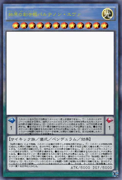 | 「始原の儀式」により降臨。このカードは儀式召喚でしか特殊召喚できない。①:このカードが特殊召喚に成功した場合に発動できる。自分の手札・墓地のカウンター罠を5枚まで選んで魔法&罠ゾーンにセットする。この効果の発動に対して、相手はカードの効果を発動できない。②:このカードがモンスターゾーンに存在する限り、以下の効果を適用する。●自分はカウンター罠を発動するために払うLPが必要なくなる。●自分はカウンター罠を発動するために捨てる手札が必要なくなる。③:このカードが戦闘を行なったダメージステップ終了時に発動できる。自分の手札・墓地のレベル8以下の「創世姫」儀式モンスター1体を選び、儀式召喚扱いで特殊召喚する。この効果で特殊召喚したモンスターは、このターン攻撃できない。④:モンスターゾーンのこのカードが戦闘・効果で破壊された場合に発動できる。自分のPゾーンのカードを全て破壊し、このカードを自分のPゾ | |||