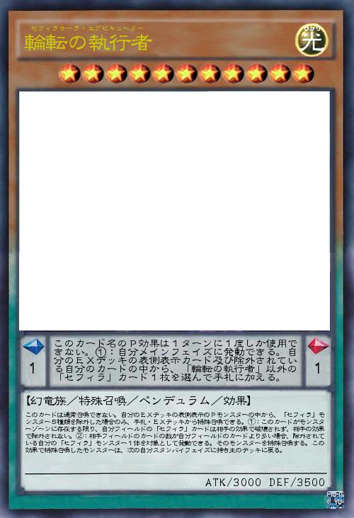 | このカード名のP効果は1ターンに1度しか使用できない。①:自分メインフェイズに発動できる。自分のEXデッキの表側表示カード及び除外されている自分のカードの中から、「輪転の執行者」以外の「セフィラ」カード1枚を選んで手札に加える。 | |||