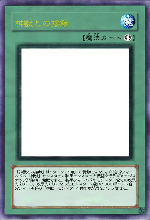 | 「神獣との接触」は1ターンに1度しか発動できない。①自分フィールドの「神獣」モンスターが相手モンスターと戦闘を行うダメージステップ開始時に発動できる。相手フィールドのモンスター全ての攻撃力を0にし、攻撃力が0になったモンスターの数×1000ポイント自分フィールドの「神獣」モンスター1体の攻撃力をアップさせる。 | |||