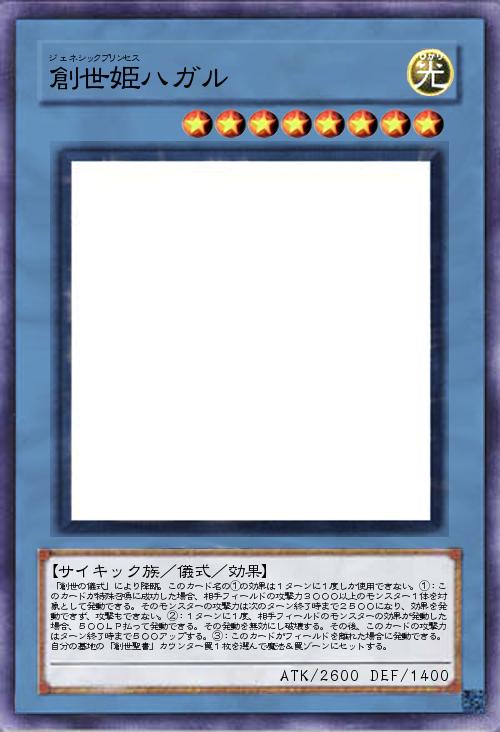 | 「創世の儀式」により降臨。このカード名の①の効果は1ターンに1度しか使用できない。①:このカードが特殊召喚に成功した場合、相手フィールドの攻撃力3000以上のモンスター1体を対象として発動できる。そのモンスターの攻撃力は次のターン終了時まで2500になり、効果を発動できず、攻撃もできない。②:1ターンに1度、相手フィールドのモンスターの効果が発動した場合、500LP払って発動できる。その発動を無効にし破壊する。その後、このカードの攻撃力はターン終了時まで500アップする。③:このカードがフィールドを離れた場合に発動できる。自分の墓地の「創世聖書」カウンター罠1枚を選んで魔法&罠ゾーンにセットする。 | |||