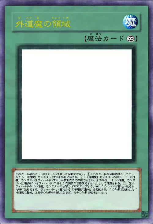 | このカード名のカードは1ターンに1枚しか発動できない。①:このカードの発動処理としてデッキから「外道魔」モンスターを1体を手札に加える。②:「外道魔」モンスターの持つ、「「外道魔」モンスターはフィールドに1体しか表側表示で存在できない。」効果は、「「外道魔」モンスターは1種類につきフィールドに1体しか表側表示で存在できない」として適用される。③:自分フィールドの「外道魔」モンスターの攻撃力は1000アップする。④:このカードが墓地へ送られた時に発動できる。デッキ・手札・墓地から「外道魔の聖域」を発動する。この効果で発動した「外道魔の聖域」は相手の効果の対象にならず、相手の効果で破壊されない。 | |||