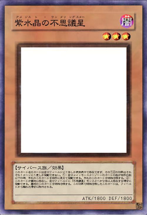 | このカード名のカードは自分フィールドに1体しか表側表示で存在できず、その①②の効果はそれぞれ1ターンに1度しか発動できない。①:自分メインモンスターゾーンのカードの数が相手の数以下の時、手札のこのカードを相手に見せて発動できる。手札のこのカードを特殊召喚する。②:このカードが墓地に存在し、自分フィールドに「不思議星」モンスターが2体以上存在する場合に発動できる。墓地のこのカードを特殊召喚する。この効果で特殊召喚したこのカードは、フィールドから離れた場合に除外される。 | |||