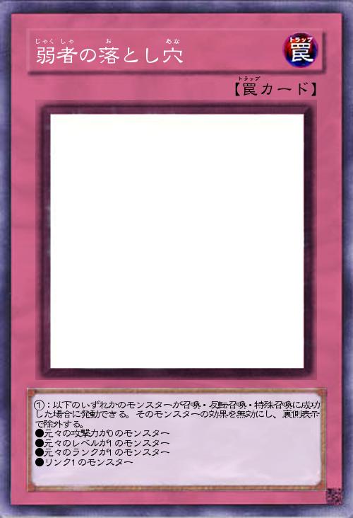 | ①:以下のいずれかのモンスターが召喚・反転召喚・特殊召喚に成功した場合に発動できる。そのモンスターの効果を無効にし、裏側表示で除外する。 ●元々の攻撃力が0のモンスター ●元々のレベルが1のモンスター ●元々のランクが1のモンスター ●リンク1のモンスター | |||