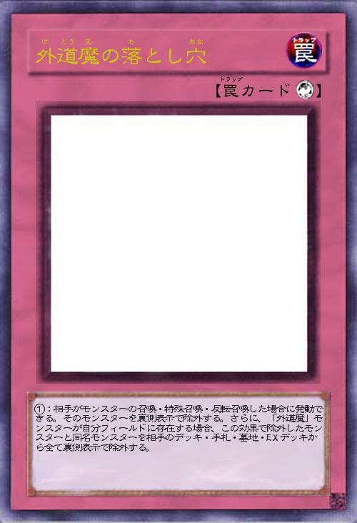 | ①:相手がモンスターの召喚・特殊召喚・反転召喚した場合に発動できる。そのモンスターを裏側表示で除外する。さらに、「外道魔」モンスターが自分フィールドに存在する場合、この効果で除外したモンスターと同名モンスターを相手のデッキ・手札・墓地・EXデッキから全て裏側表示で除外する。 | |||