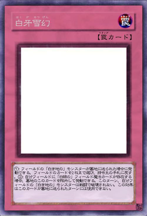 | ①:フィールドの「白き地の」モンスターが墓地に送られた場合に発動できる。フィールドのカードを2枚まで選び、持ち主の手札に戻す。②:自分フィールドに「白銀の」フィールド魔法カードが存在する場合、墓地のこのカードを除外して発動できる。このターン、自分フィールドの「白き地の」モンスターは戦闘で破壊されない。この効果はこのカードが墓地に送られたターンには使用できない。 | |||