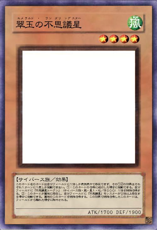 | このカード名のカードは自分フィールドに1体しか表側表示で存在できず、その①②の効果はそれぞれ1ターンに1度しか発動できない。①:このカードの召喚に成功した場合に発動できる。自分フィールドに「不思議星トークン」(サイバース族・風・星1・攻/守200)1体を特殊召喚する。②:このカードが墓地に存在し、自分フィールドに「不思議星」モンスターが2体以上存在する場合に発動できる。墓地のこのカードを特殊召喚する。この効果で特殊召喚したこのカードは、フィールドから離れた場合に除外される。 | |||