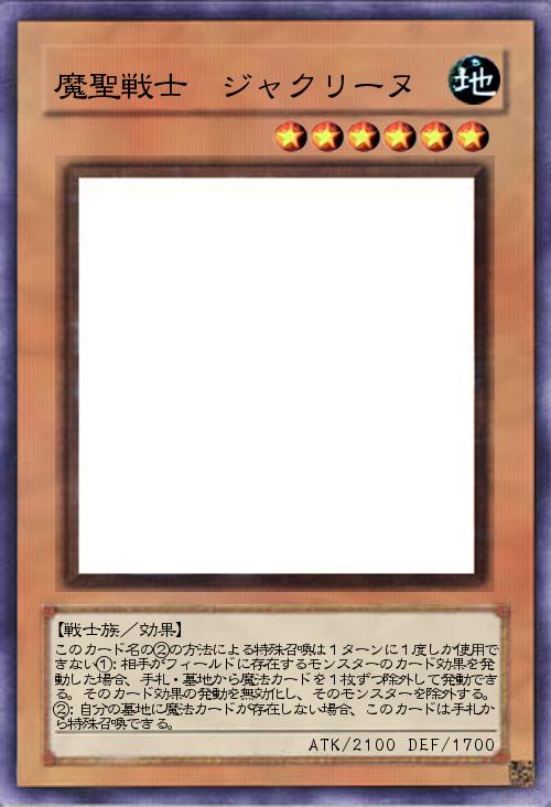 | このカード名の②の方法による特殊召喚は1ターンに1度しか使用できない①:相手がフィールドに存在するモンスターのカード効果を発動した場合、手札・墓地から魔法カードを1枚ずつ除外して発動できる。そのカード効果の発動を無効化し、そのモンスターを除外する。②:自分の墓地に魔法カードが存在しない場合、このカードは手札から特殊召喚できる。 | |||