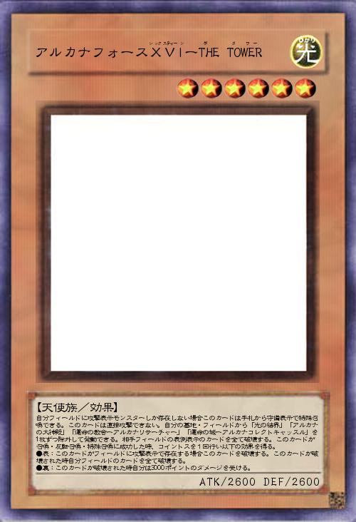 | 自分フィールドに攻撃表示モンスターしか存在しない場合このカードは手札から守備表示で特殊召喚できる。このカードは直接攻撃できない。自分の墓地・フィールドから「光の結界」「アルカナの大神殿」「運命の教会ーアルカナリサーチャー」「運命の城ーアルカナコレクトキャッスル」を1枚ずつ除外して発動できる。相手フィールドの表側表示のカードを全て破壊する。このカードが召喚・反転召喚・特殊召喚に成功した時、コイントスを1回行い以下の効果を得る。 ●表:このカードがフィールドに攻撃表示で存在する場合このカードを破壊する。このカードが破壊された時自分フィールドのカードを全て破壊する。 ●裏:このカードが破壊された時自分は3000ポイントのダメージを受ける。 | |||