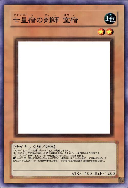 | このカード名の(2)の効果は1ターンに1度しか発動できない。 (1):このカードが召喚に成功した時に発動出来る。手札から「七星宿」モンスター1枚捨てる。 (2):このカードを素材としている「七星宿」Xモンスターは以下の効果を得る。 ●1ターンに1度、墓地に存在するレベル4以下の「七星宿」モンスター1体を対象にして発動できる。そのモンスターをこのカードの下に敷きX素材とする。その後「七星宿の剤師 室宿」1体を取り除く。 | |||