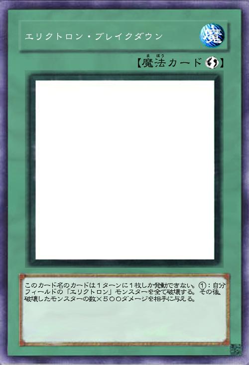 | このカード名のカードは1ターンに1枚しか発動できない。①:自分フィールドの「エリクトロン」モンスターを全て破壊する。その後、破壊したモンスターの数×500ダメージを相手に与える。 | |||