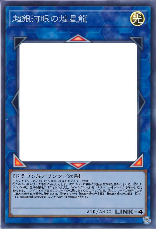 | 「ギャラクシーアイズ」Xモンスターを含むモンスター2体以上 ①このカードがリンク召喚に成功したとき、次のターンに相手が発動する効果は無効化される。②1ターンに一度、自分の墓地の「フォトン」又は「ギャラクシー」モンスター1体をゲームから除外して発動できる。エンドフェイズまでこのカードの攻撃力を1000アップする。③このカードが相手によって墓地へ送られた場合に発動できる。EXデッキから「超銀河眼の光子龍」「超銀河眼の光波龍」「CNo.108超銀河眼の時空龍」のいずれか1体を特殊召喚する。 | |||