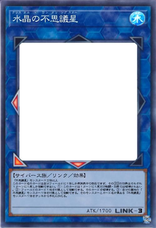 | 「不思議星」モンスター×2体以上 このカード名のカードは自分フィールドに1体しか表側表示で存在できず、その②③の効果はそれぞれ1ターンに1度しか発動できない。①:このカードは1ターンに1度だけ戦闘・効果では破壊されない。②:フィールドのカード1枚を対象として発動できる。そのカードを破壊する。③:自分の墓地の「不思議星」モンスター1体を対象として発動できる。そのモンスターとカード名が異なる「不思議星」モンスター1体をデッキから手札に加える。 | |||