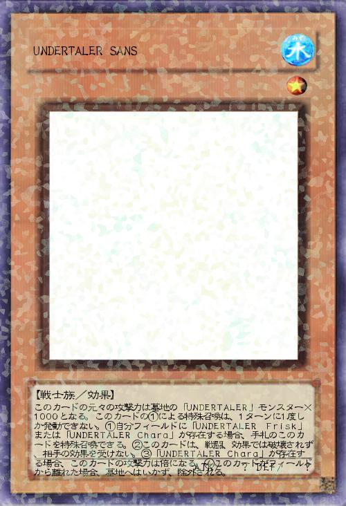 | このカードの元々の攻撃力は墓地の「UNDERTALER」モンスター×1000となる。このカードの①による特殊召喚は、1ターンに1度しか発動できない。①自分フィールドに「UNDERTALER Frisk」または「UNDERTALER Chara」が存在する場合、手札のこのカードを特殊召喚できる。②このカードは、戦闘、効果では破壊されず、相手の効果を受けない。③「UNDERTALER Chara」が存在する場合、このカードの攻撃力は倍になる。④このカードがフィールドから離れた場合、墓地へはいかず、除外される。 | |||