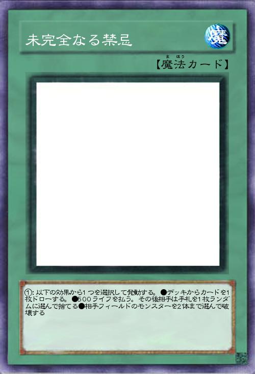 | ①:以下の効果から1つを選択して発動する。●デッキからカードを1枚ドローする。●500ライフを払う。その後相手は手札を1枚ランダムに選んで捨てる●相手フィールドのモンスターを2体まで選んで破壊する | |||