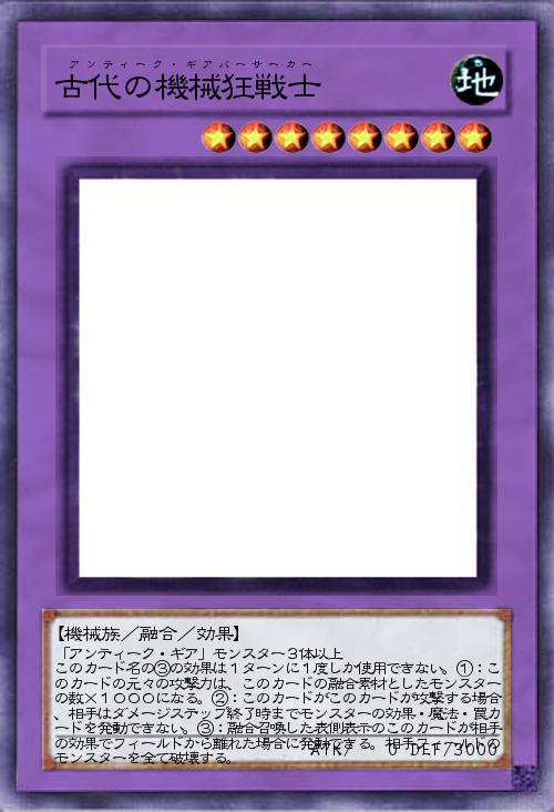 | 「アンティーク・ギア」モンスター3体以上 このカード名の③の効果は1ターンに1度しか使用できない。①:このカードの元々の攻撃力は、このカードの融合素材としたモンスターの数×1000になる。②:このカードがこのカードが攻撃する場合、相手はダメージステップ終了時までモンスターの効果・魔法・罠カードを発動できない。③:融合召喚した表側表示のこのカードが相手の効果でフィールドから離れた場合に発動できる。相手フィールドのモンスターを全て破壊する。 | |||