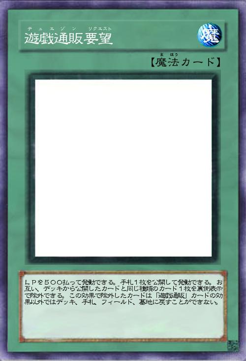 | LPを500払って発動できる。手札1枚を公開して発動できる。お互い、デッキから公開したカードと同じ種類のカード1枚を裏側表示で除外できる。この効果で除外したカードは「遊戯通販」カードの効果以外ではデッキ、手札、フィールド、墓地に戻すことができない。 | |||