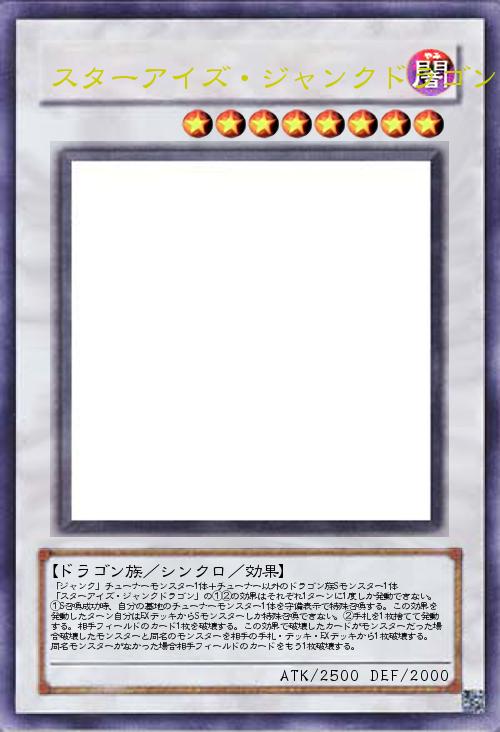 | 「ジャンク」チューナーモンスター1体+チューナー以外のドラゴン族Sモンスター1体 「スターアイズ・ジャンクドラゴン」の①②の効果はそれぞれ1ターンに1度しか発動できない。①S召喚成功時、自分の墓地のチューナーモンスター1体を守備表示で特殊召喚する。この効果を発動したターン自分はEXデッキからSモンスターしか特殊召喚できない。②手札を1枚捨てて発動する。相手フィールドのカード1枚を破壊する。この効果で破壊したカードがモンスターだった場合破壊したモンスターと同名のモンスターを相手の手札・デッキ・EXデッキから1枚破壊する。同名モンスターがなかった場合相手フィールドのカードをもう1枚破壊する。 | |||