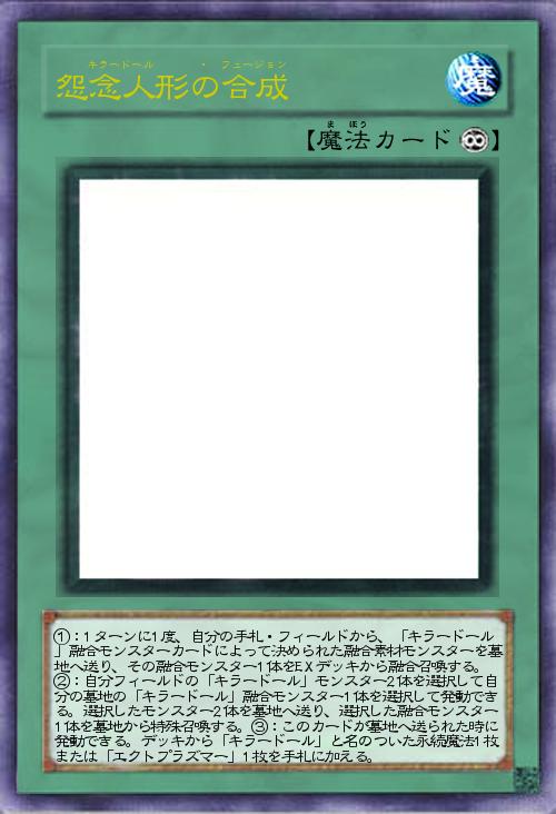 | ①:1ターンに1度、自分の手札・フィールドから、「キラードール」融合モンスターカードによって決められた融合素材モンスターを墓地へ送り、その融合モンスター1体をEXデッキから融合召喚する。②:自分フィールドの「キラードール」モンスター2体を選択して自分の墓地の「キラードール」融合モンスター1体を選択して発動できる。選択したモンスター2体を墓地へ送り、選択した融合モンスター1体を墓地から特殊召喚する。③:このカードが墓地へ送られた時に発動できる。デッキから「キラードール」と名のついた永続魔法1枚または「エクトプラズマー」1枚を手札に加える。 | |||