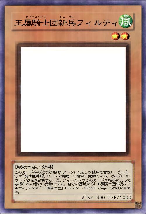 | このカード名の②の効果は1ターンに1度しか使用できない。①:自分が「騎士団陣形」カードを発動した場合に発動できる。手札のこのカードを特殊召喚する。②:フィールドのこのカードが相手によって破壊された場合に発動できる。自分の墓地から「王属騎士団新兵フィルティ」以外の「王属騎士団」モンスターを2体まで選んで手札に加える。 | |||