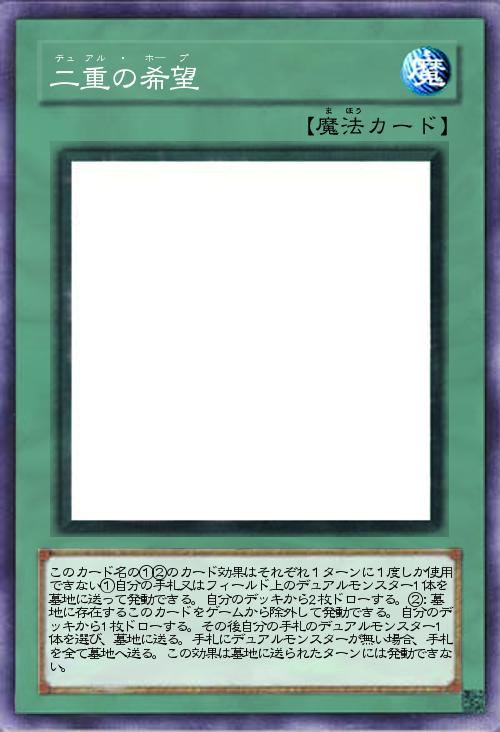 | このカード名の①②のカード効果はそれぞれ1ターンに1度しか使用できない①自分の手札又はフィールド上のデュアルモンスター1体を墓地に送って発動できる。自分のデッキから2枚ドローする。②:墓地に存在するこのカードをゲームから除外して発動できる。自分のデッキから1枚ドローする。その後自分の手札のデュアルモンスター1体を選び、墓地に送る。手札にデュアルモンスターが無い場合、手札を全て墓地へ送る。この効果は墓地に送られたターンには発動できない。 | |||