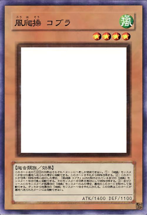 | このカード名の①②③の効果はそれぞれ1ターンに1度しか使用できない。①:「爬操」モンスターが自分の墓地へ送られた場合に発動できる。このカードを手札から特殊召喚する。②:このカードが召喚・特殊召喚に成功した場合、「風爬操 コブラ」以外の除外されている自分の「爬操」モンスター1体を対象と発動できる。そのモンスターを効果を無効にして特殊召喚する。③:自分フィールドのモンスターが風属性の「爬操」モンスターのみの場合、墓地のこのカードを除外して発動できる。デッキから地属性の「爬操」モンスター1体を手札に加える。この効果はこのカードが墓地へ送られたターンには発動できない。 | |||