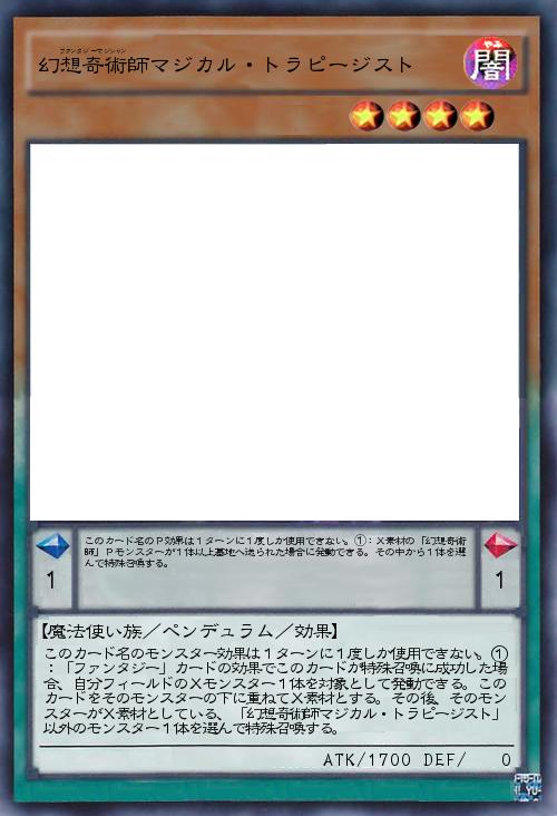| このカード名のモンスター効果は1ターンに1度しか使用できない。①:「ファンタジー」カードの効果でこのカードが特殊召喚に成功した場合、自分フィールドのXモンスター1体を対象として発動できる。このカードをそのモンスターの下に重ねてX素材とする。その後、そのモンスターがX素材としている、「幻想奇術師マジカル・トラピージスト」以外のモンスター1体を選んで特殊召喚する。 | |||