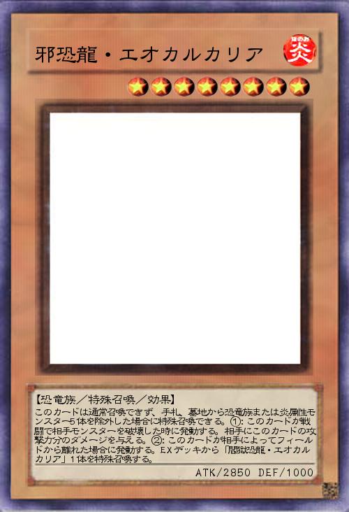 | このカードは通常召喚できず、手札、墓地から恐竜族または炎属性モンスター5体を除外した場合に特殊召喚できる。①:このカードが戦闘で相手モンスターを破壊した時に発動する。相手にこのカードの攻撃力分のダメージを与える。②:このカードが相手によってフィールドから離れた場合に発動する。EXデッキから「閻獄恐龍・エオカルカリア」1体を特殊召喚する。 | |||