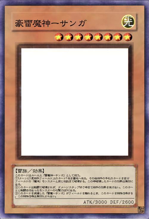 | このカードはルール上「雷魔神ーサンガ」として扱う。 ①1ターンに1度相手フィールド上のカード1枚を墓地へ送る。その後相手の手札のカードを自分フィールドの「魔神」モンスターと同じ枚数まで破壊する。この時破壊したカードの効果は無効になる。 ②このカードは戦闘で破壊されず、ダメージステップ終了時まで相手の効果を受けない。このカードと戦闘を行なったモンスターの攻撃力は0になる。 ③このカードを装備した「雷魔ーサンガ」がフィールドを離れるとき、このカードを特殊召喚する。この特殊召喚は無効化されない。 | |||