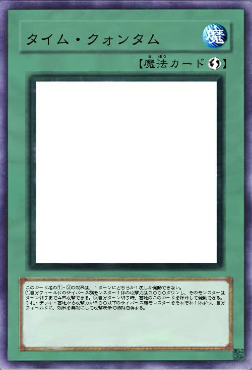 | このカード名の①・②の効果は、1ターンにどちらか1度しか発動できない。 ①自分フィールドのサイバース族モンスター1体の攻撃力は2000ダウンし、そのモンスターはターン終了まで4回攻撃できる。②自分ターン終了時、墓地のこのカードを除外して発動できる。手札・デッキ・墓地から攻撃力が500以下のサイバース族モンスターをそれぞれ1体ずつ、自分フィールドに、効果を無効にして攻撃表示で特殊召喚する。 | |||